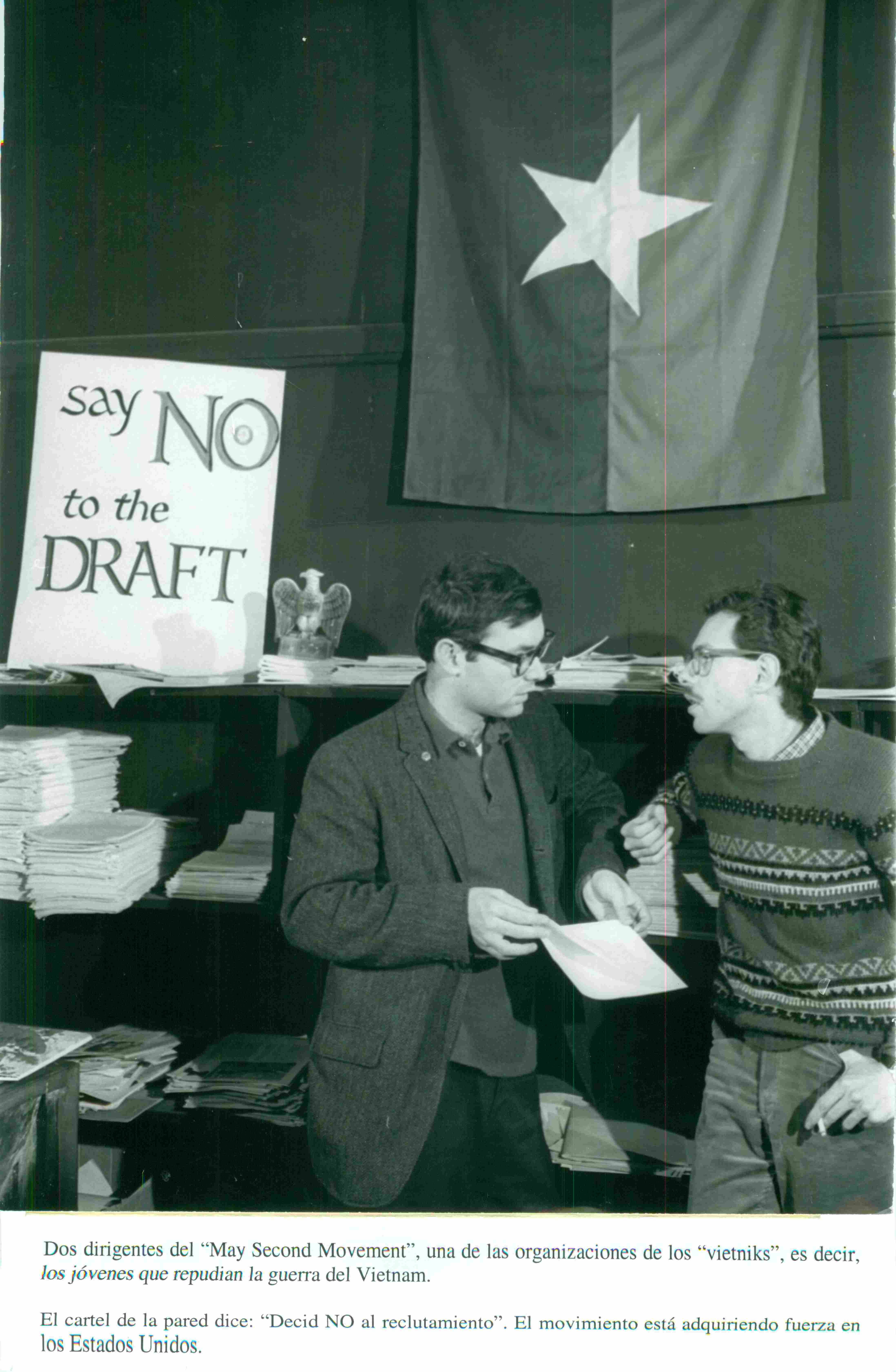 Dos dirigentes del "May Second Movement", una de las organizaciones de los "vietniks", es decir los jóvenes que repudian la guerra de Vietnam. El cartel de la pared dice "decir NO al reclutamiento". El movimiento está adquiriendo fuerza en los Estados Unidos