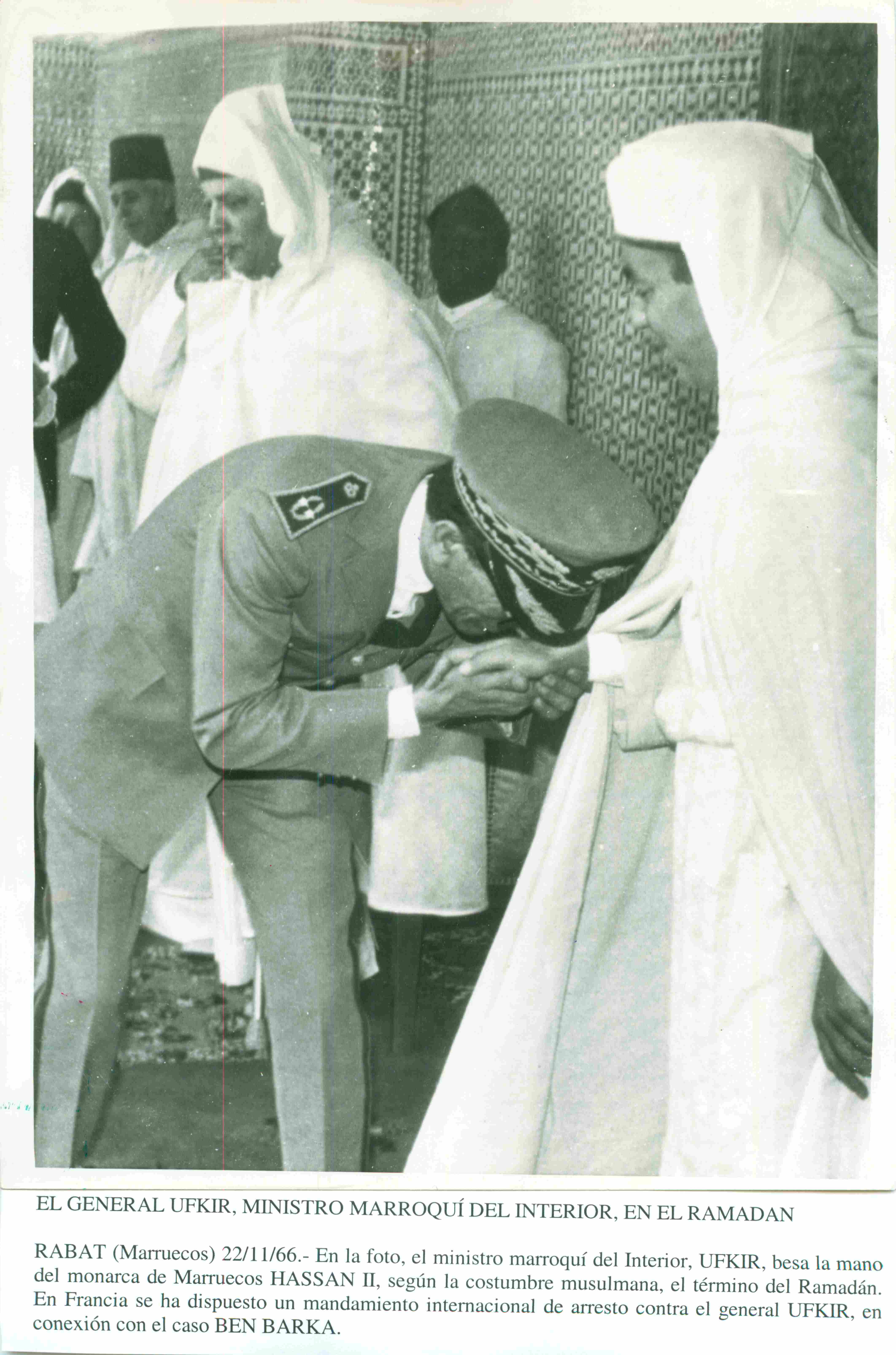 El general Ufkir, ministro marroquí del interior, en el Ramadán. Rabat (Marruecos) 22-11-66. En la foto, el ministro marroquí del interior, Ufkir, besa la mano del monarca de Marruecos Hassan II, según la costumbre musulmana, el término del Ramadán. En Francia se ha dispuesto un mandamiento internacional de arresto contra el general Ufkir, en el caso Ben Barka.